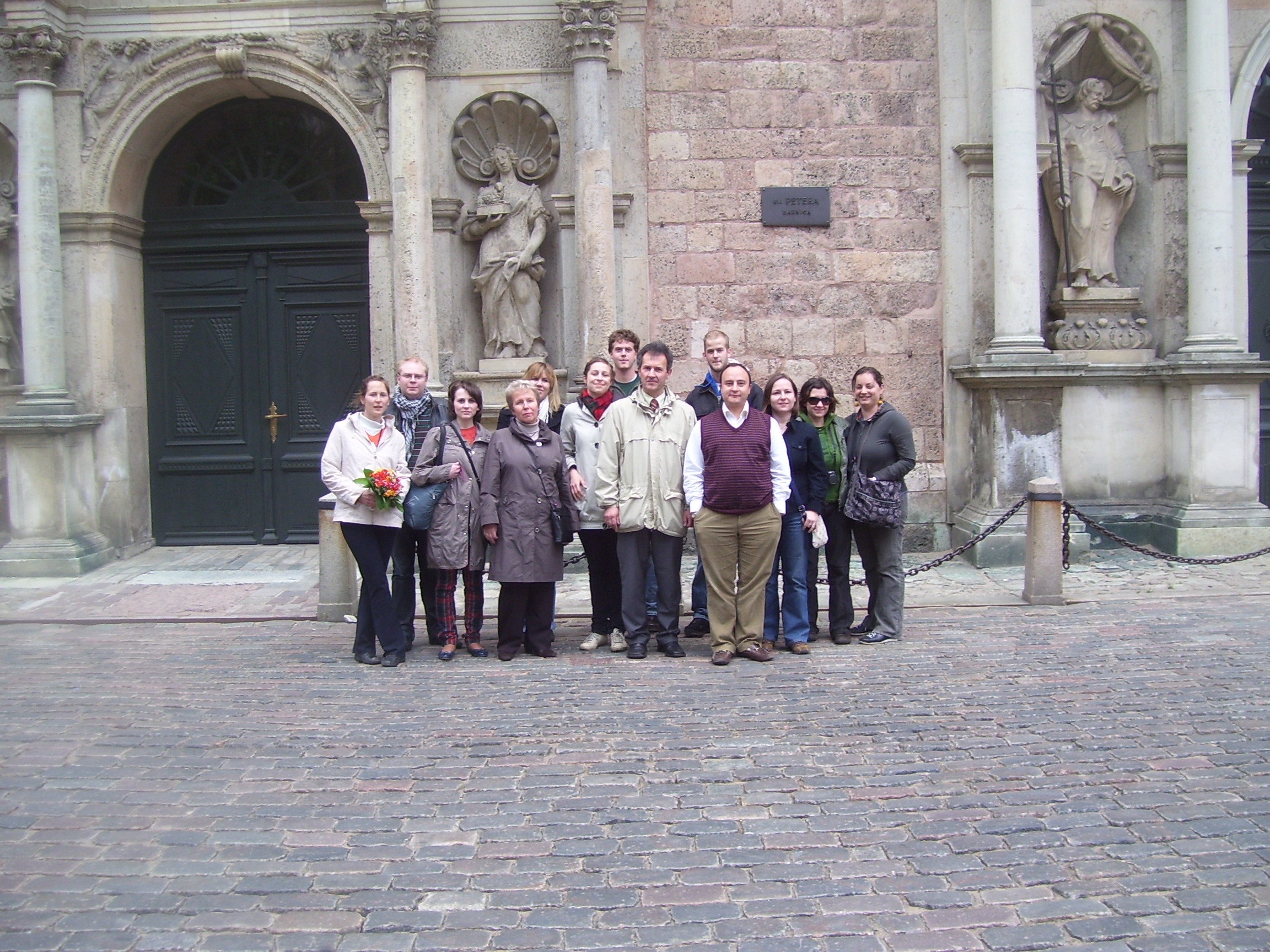 Dalībnieki uz Pēterbaznīcas portāla fona
